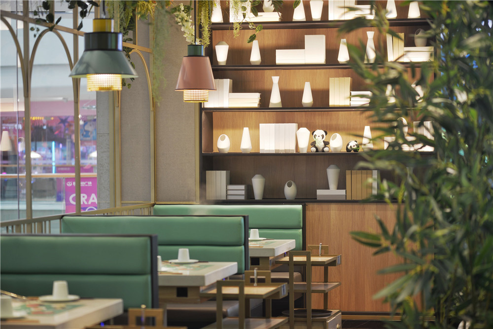 餐厅强调原始的自然和独创性,沿着空气中蔓延开的竹清气味看到英姿飒爽的竹子、熊猫、现代感的灯具、造型各异的镂空钢板,搭配绿色背景墙的点缀,温暖而素雅。